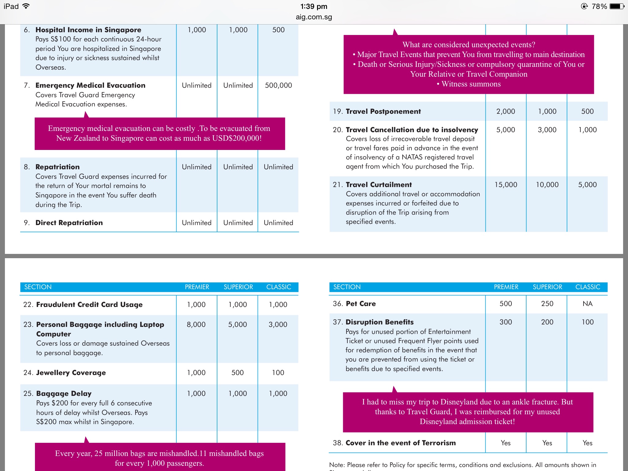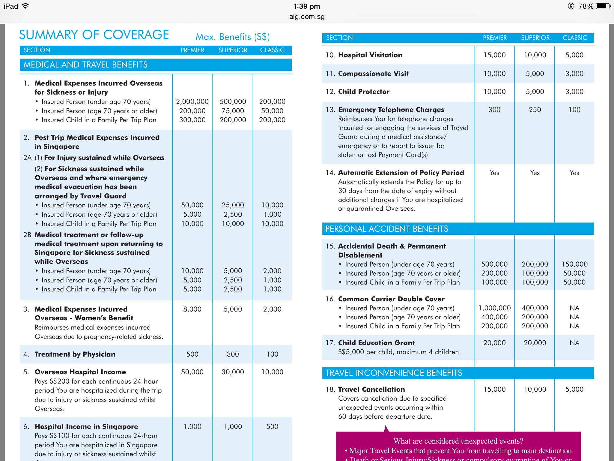 DBS的航空意外险是ACE underwrite的,不算旅游保险,和个人意外保单类似,但只保空中发生的情况。Citi目前的保障范围和保额最好,而且是AIG Underwrite的,所以算AIG的客户可以使用其全球的热线和资源