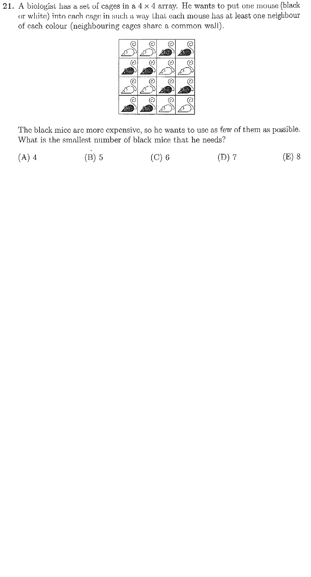 再证明至少需要六个,证明的思路是对棋盘分割(区域染色),尽量做到不交的区域的并集,每个区域里至少需要1个黑鼠。以下为坐标,(i,j ) for i <= 4 and j <= 4