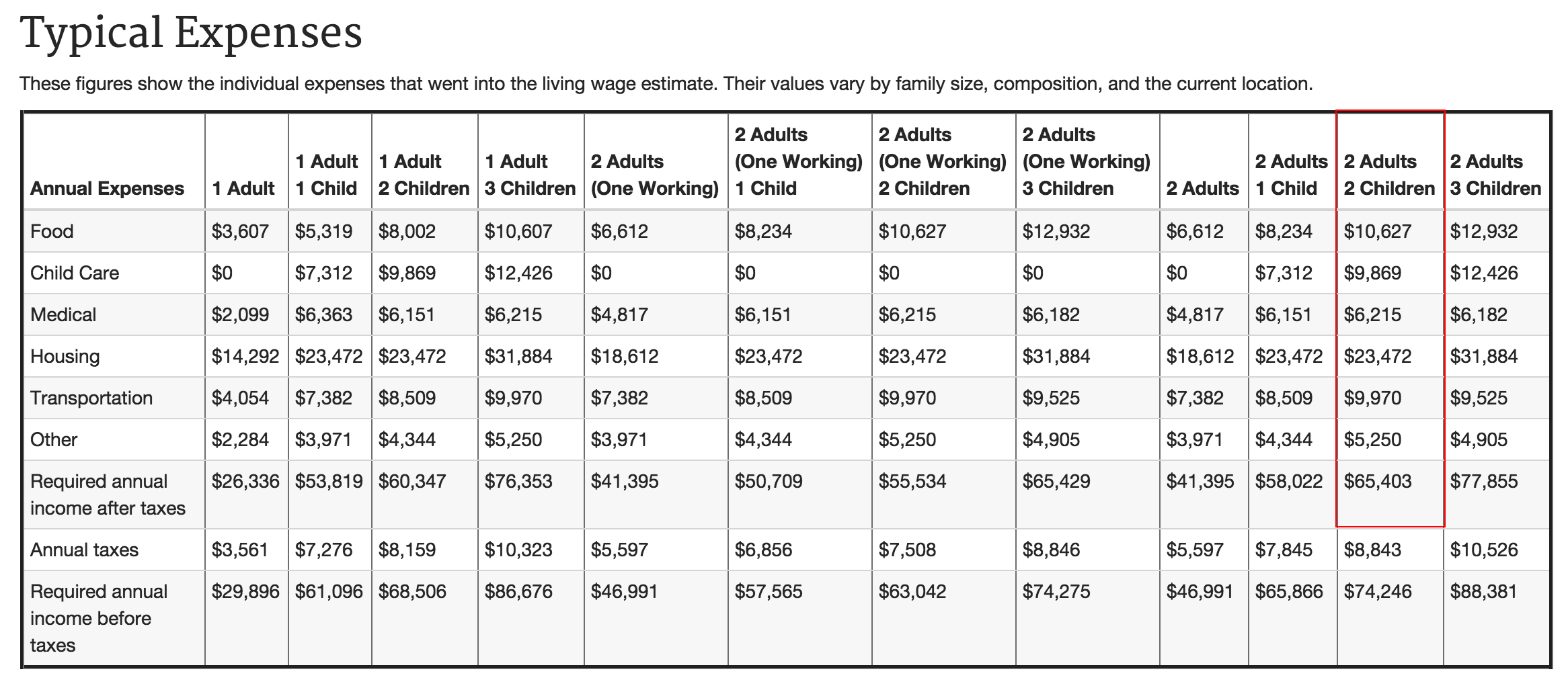 The Canadian Living Wage Framework calculates a living wage that would allow two income earners to support a family of four and assumes the following scenario: