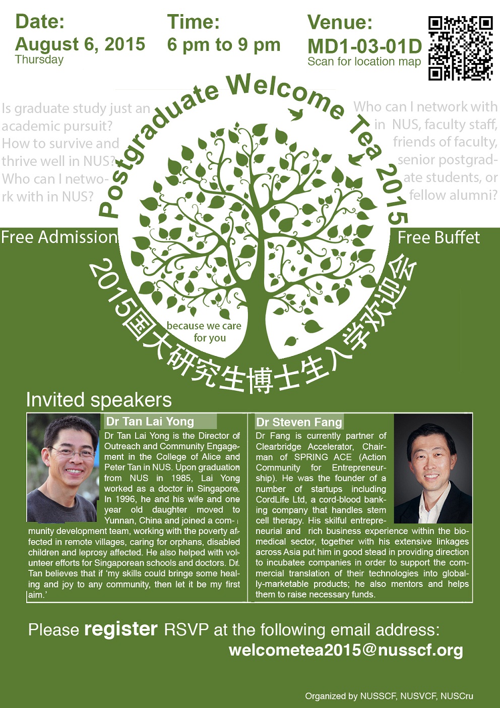 如果你觉得这些都很重要,那么来参与2015年8月6日周四晚上6点在NUS MD1-03-01D的迎新茶话会吧!会上将邀请分别来自学术界和工业界的两位大老板做生动演讲和分享,之后还可以和NUS的教授教员们、业界的工作人士以及高年级研究生们同桌交流,建立人脉。而且所有这些包括自助晚餐都是免费的!还等什么?赶紧电邮你的姓名、院系、联系电话给[email protected]来报名吧!也欢迎你带朋友们一起来,同样把他们的信息一起写在email里面即可。