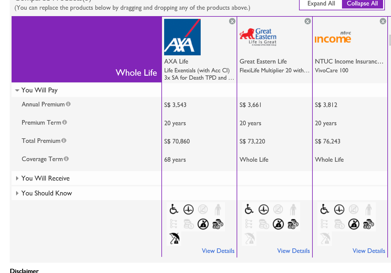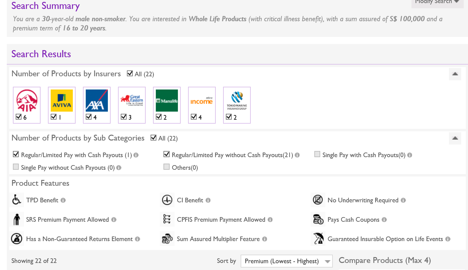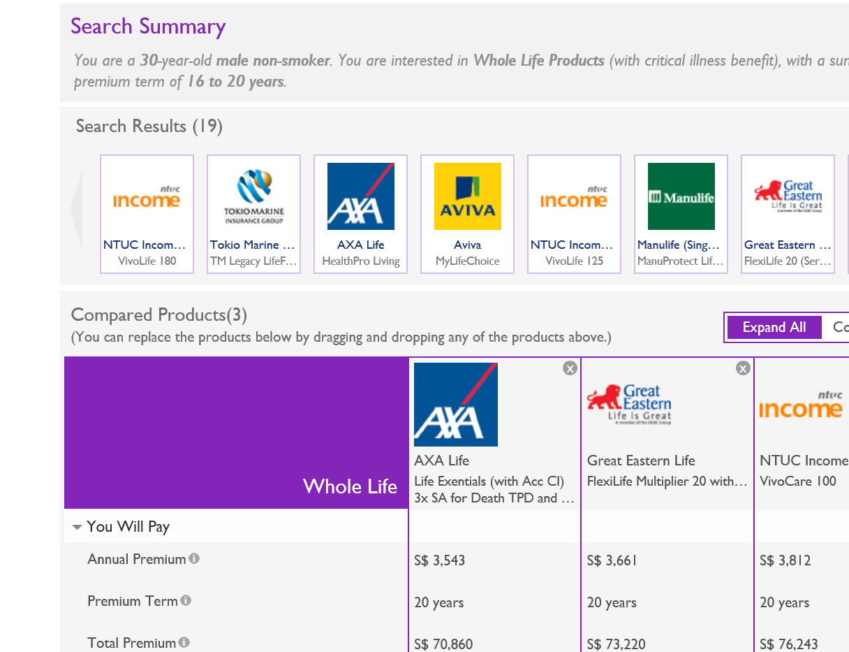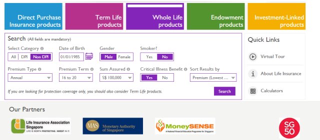 这个网站是2015年4月正式由政府发行的,为大家提供一个平台,帮助浏览新加坡不同保险公司销售的人寿保险,提供产品的对比,让消费者更加了解保险产品,能够根据自身的需求来购买合适的保险产品。网站上可提供对比的保险产品包括定期寿险term life、终身寿险whole life以及储蓄保险产品endowment,和投资链接保险ILP。