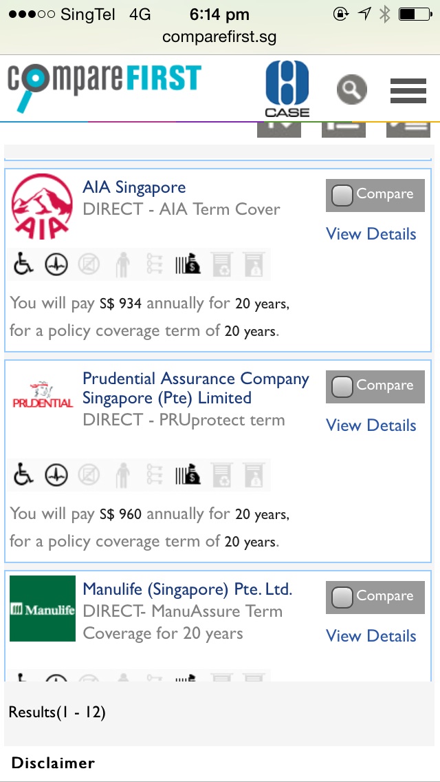 大家经常说新加坡的保险产品大同小异,通过这个网站可以更加容易让我们看到小异到底不同在哪里,请看下图以1985年1月1日男性非吸烟者为例,购买基础保额100K,20年的limited payment,保障死亡,终生残疾,重大疾病的保单来做对比,在网站上输入相应的信息,search 后会出现搜索结果,因为目前市场上有很多人寿产品是有多倍保额的功能(2-3.5倍不等),所以比较的时候要特别的注意,如果看不懂,可以咨询你的保险经纪