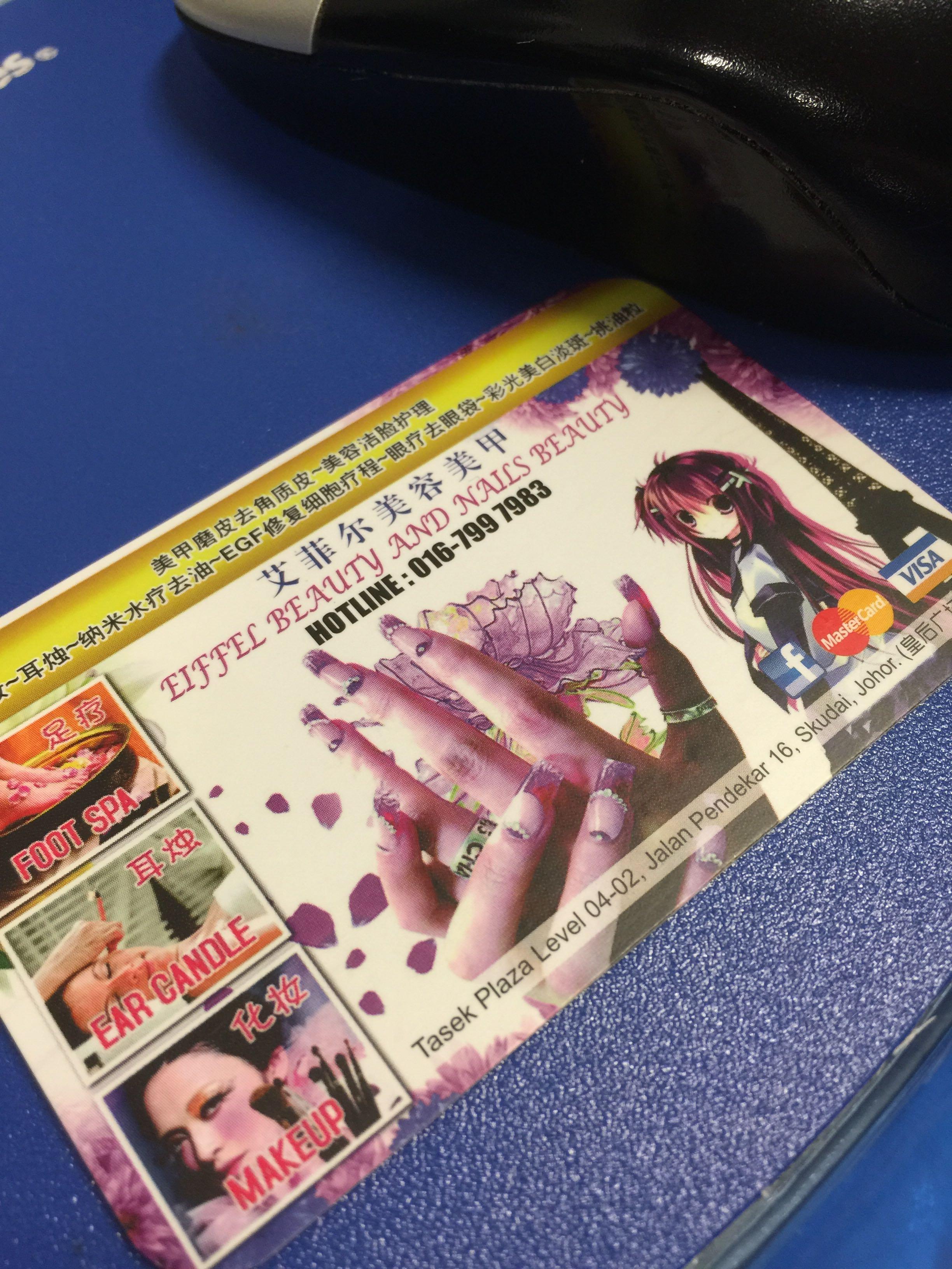 去新山享受美容美甲吧现在新币对换马币那么高,我和朋友每个月都会去新山一两次好好滴享受生活了也顺便看戏找东西吃耶。介绍你这家美容院是在新山皇后广场,她们服务亲切很有礼貌,价格公道不吭人,去新山是我们必到之处哦。值得介绍给大家!好棒!