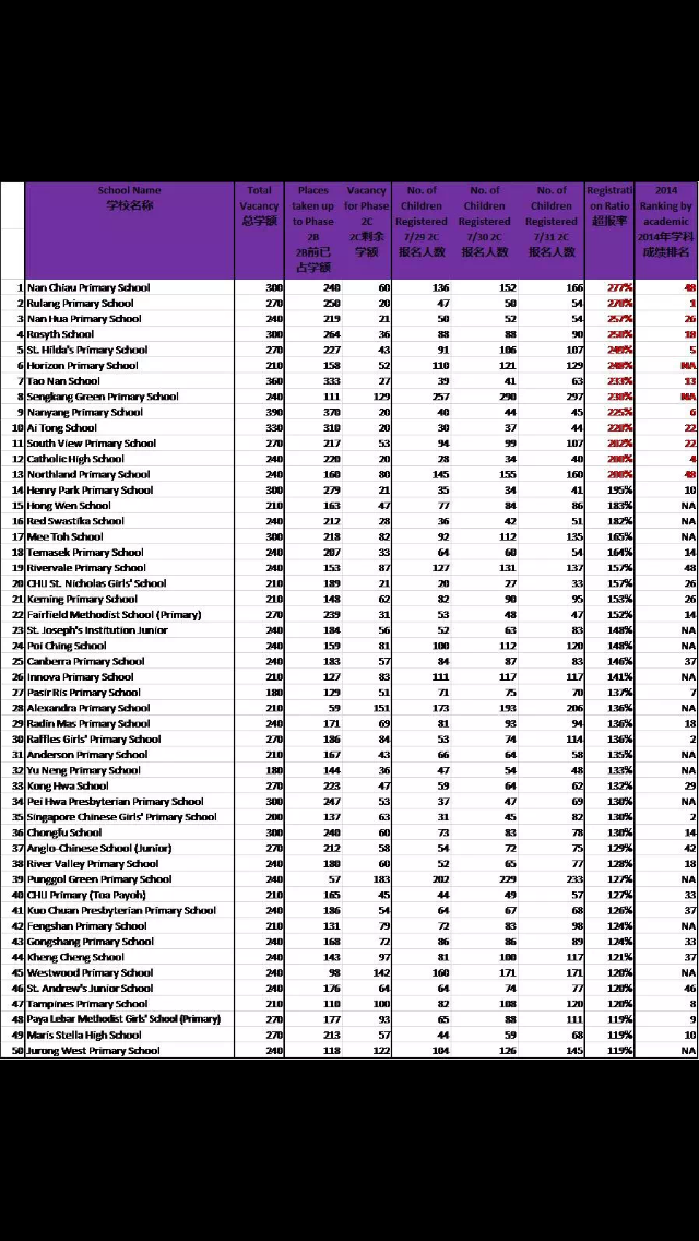 这里贴上今年(2015)小一2C阶段报名超额较多的前50名学校,里面有West Wood和Jurong West。要具体的排名可以加我的微信。