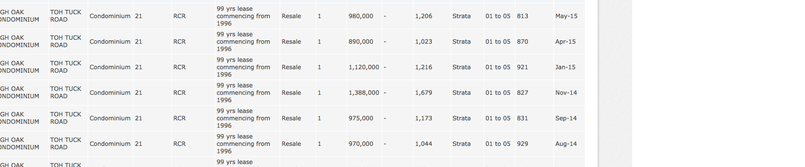 Units For Rent:About High Oak CondoDevelopment Name:High Oak CondoProperty Type:CondominiumDeveloper:High Oak Properties Pte LtdTenure:99-year LeaseholdCompletion Year:2000# of Floors:4# of Units:194 High Oak Condo is a 99-years leasehold development located at 11 Toh Tuck Road 596290 in district 2. Completed in 2000, the development is four storey tall and comprises 194 units.