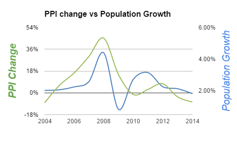 这幅图的关系可能没有前2幅那么明显,但相信大家都同意,利息的增长对房产价格的打压,但是过去10年的经验表明,似乎人口增长带来的影响远大于利息的影响,或者说利息对房价的影响有一个延后时间,而人口的增长对房价的影响是瞬时的。