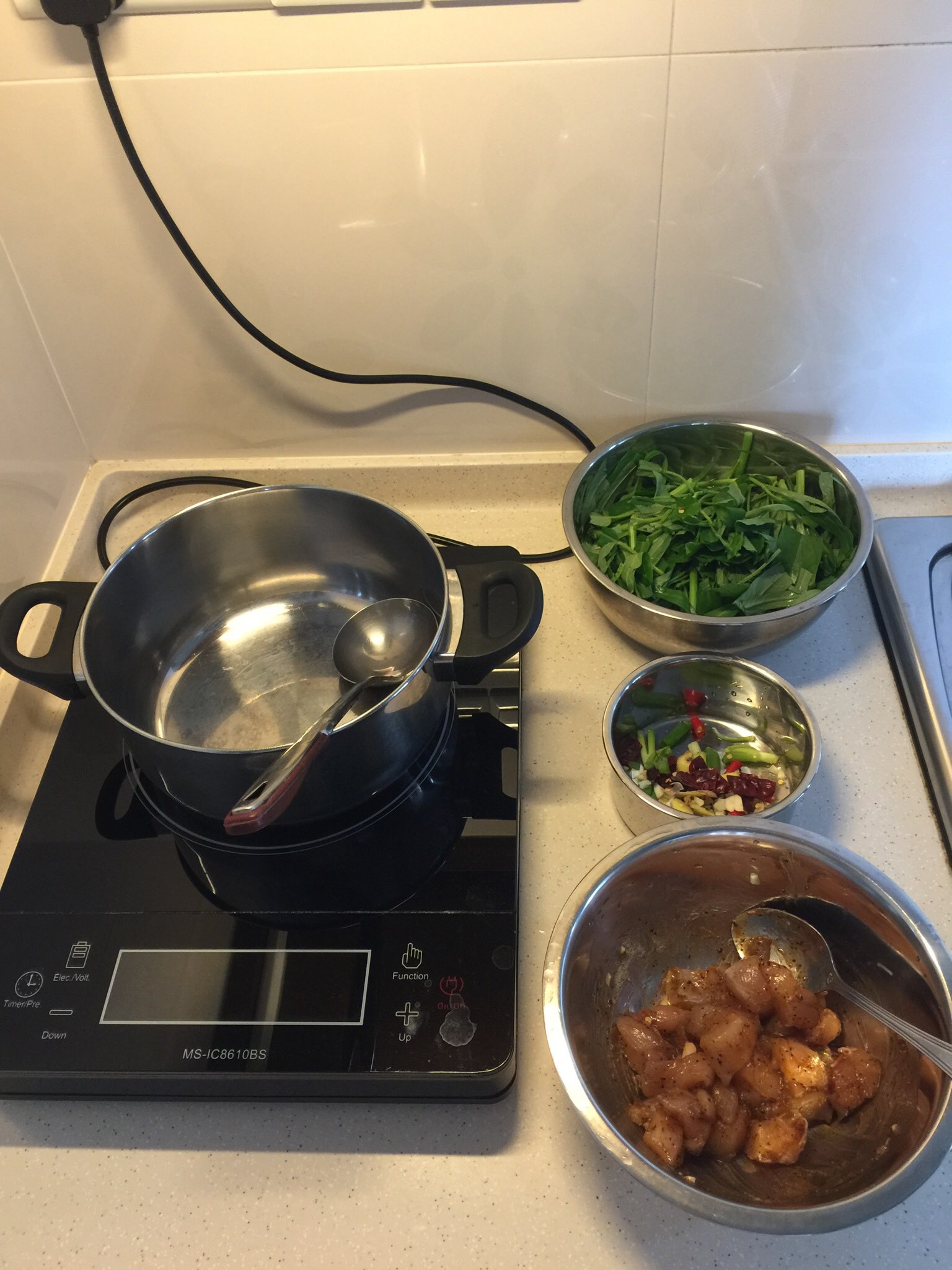今天晚饭 小炒来个素炒空心菜 配腌的黑胡椒鸡胸肉。健身完就得这么吃!