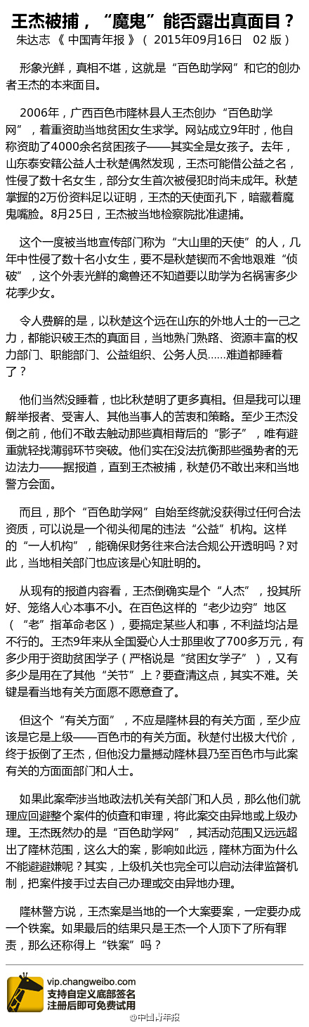 功夫熊猫 • • 53798 次浏览【王杰被捕,“魔鬼”能否露出真面目?】这个一度被称为“大山里的天使”的人,几年中性侵了数十名小女生。山东青年秋楚付出极大代价扳倒了王杰,但他没力量撼动其他人。隆林警方说,王杰案一定要办成一个铁案。如果最后只是王杰一个人顶下了所有罪责,那么还称得上“铁案”吗?