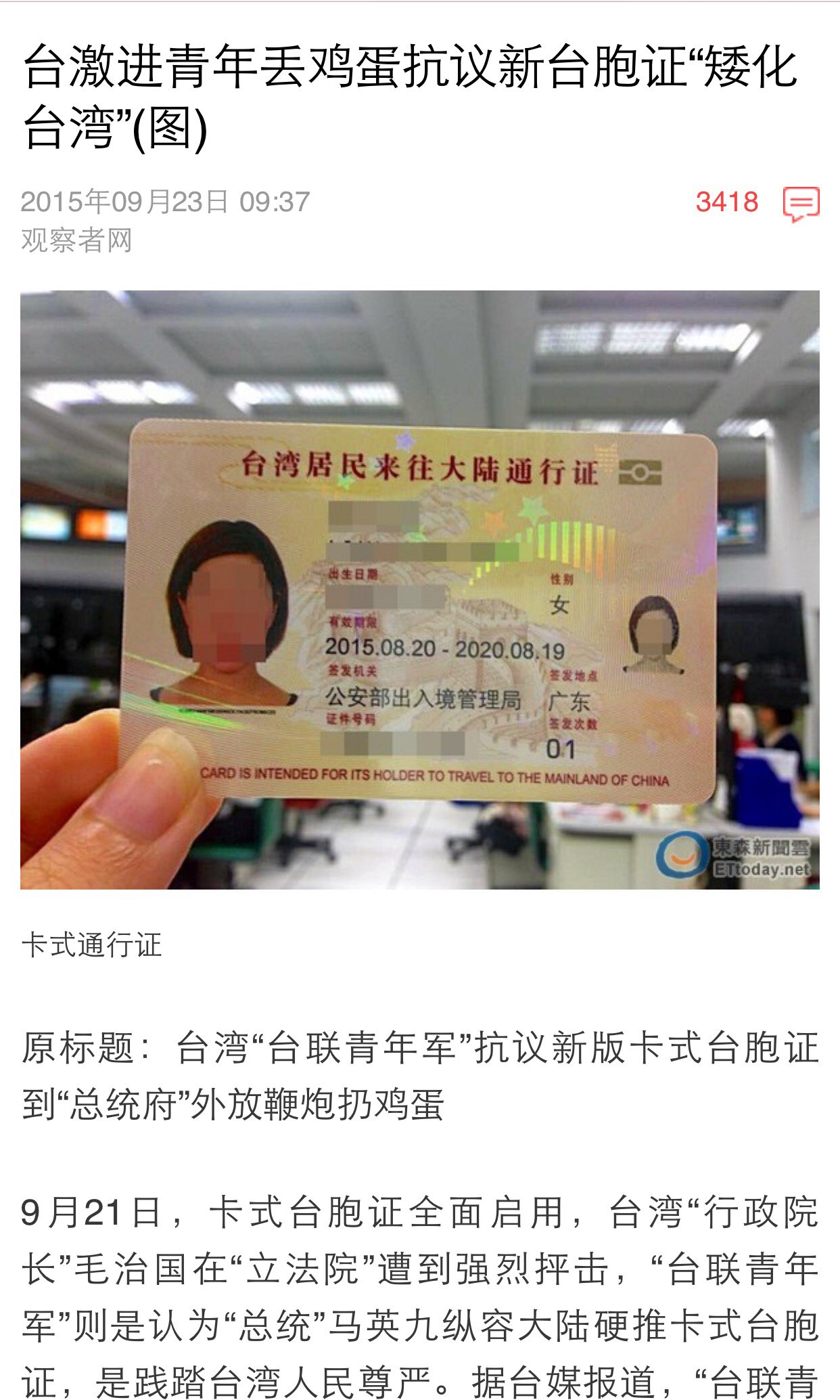 17eye • • 53671 次浏览大陆这一招好牛啊,把台湾人等同大陆人,给他们发台胞证,和身份证一样的用处,这就是让台湾人自己选择,你觉得大陆不错,你就拿,你看不上,就别拿,不过台湾青年抗议马英九干什么????大陆发的,你应该到北京抗议啊。这就是一边让你烂下去,一边自己强大还对你示好,真正的让你用脚投票。