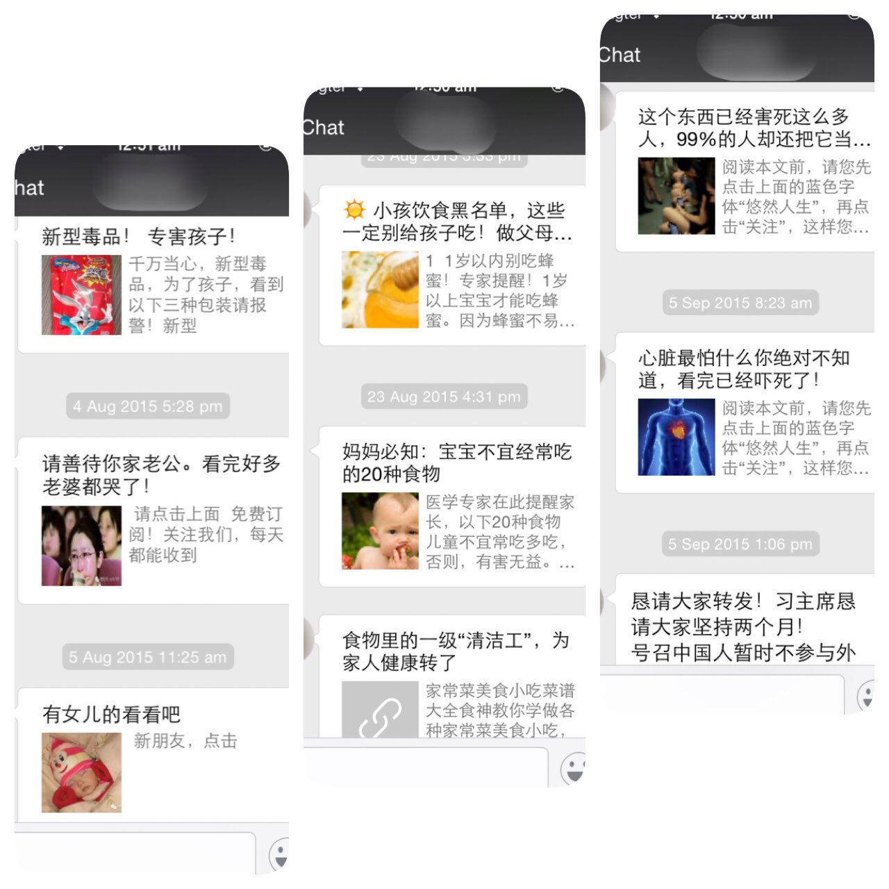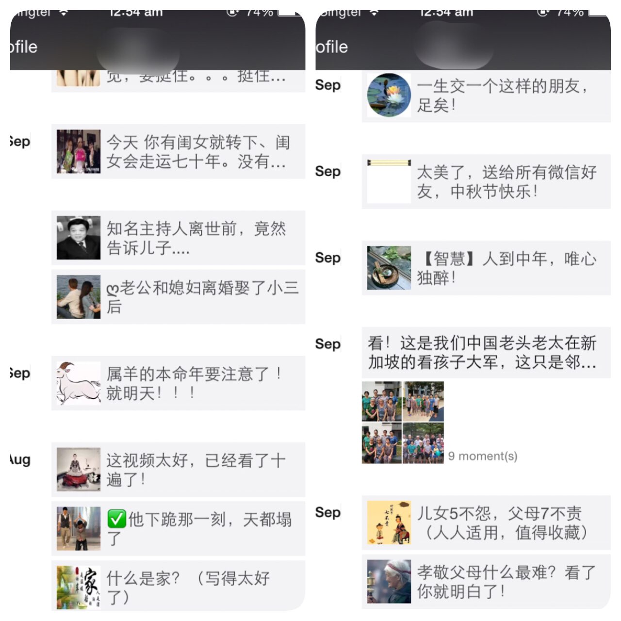 朋友圈天天被他们刷屏各种主题,心灵鸡汤,政治,经济,还有种伪科学理论……无所不转,有时侯他们觉得很好的除了发朋友圈还私下给我再发一遍,也是醉了