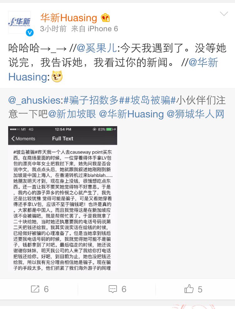 过去两个礼拜了,本来已经忘了,突然间看到这条微博,果然是被骗了,最无语的事,连台词都一模一样!!!没想到在坡碰到这样的事,大概下次再遇到这样的事,肯定会犹豫很久,第一个反应就是猜测你有没有骗我。