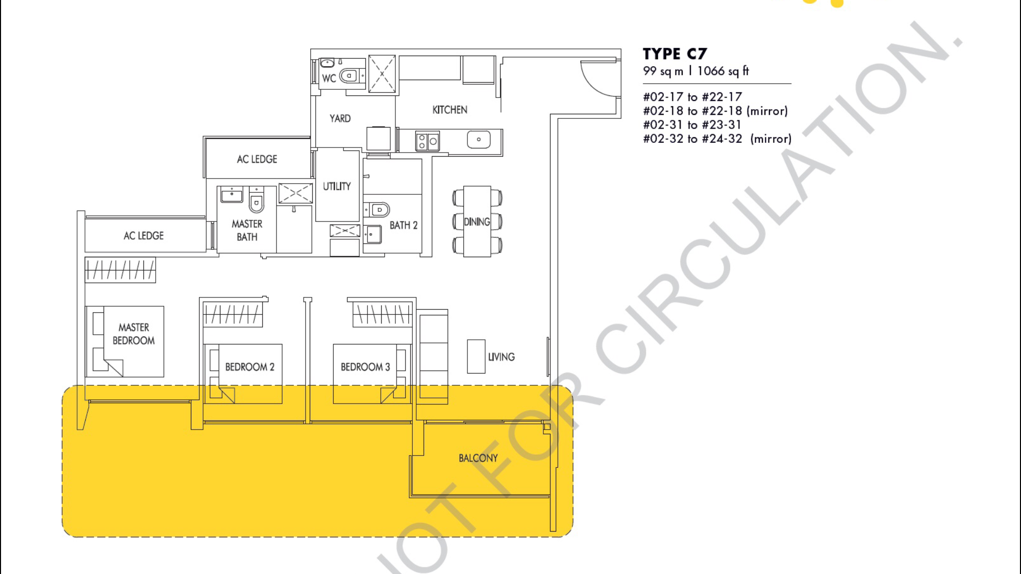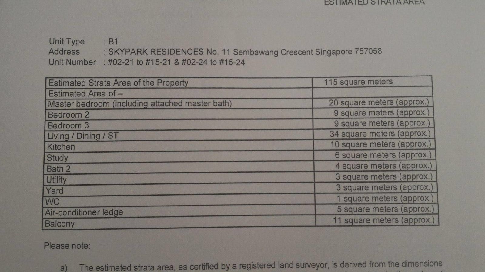 记住哦,在你准备给5%定金支票的时候,发展商会给解释一份PDI(Particular, Documents, Information)。里面一定会有一份文件叫做Estimated Strata Area,会详细描述房子每个部分的面积。PDI整套会很厚,千万不要草草签字了事。如果你发现房间面积很小,不接受。你是可以收回你的5%的支票哦。给大家看看这个文件的范本(这个户型阳台不坑爹,大小刚刚好):