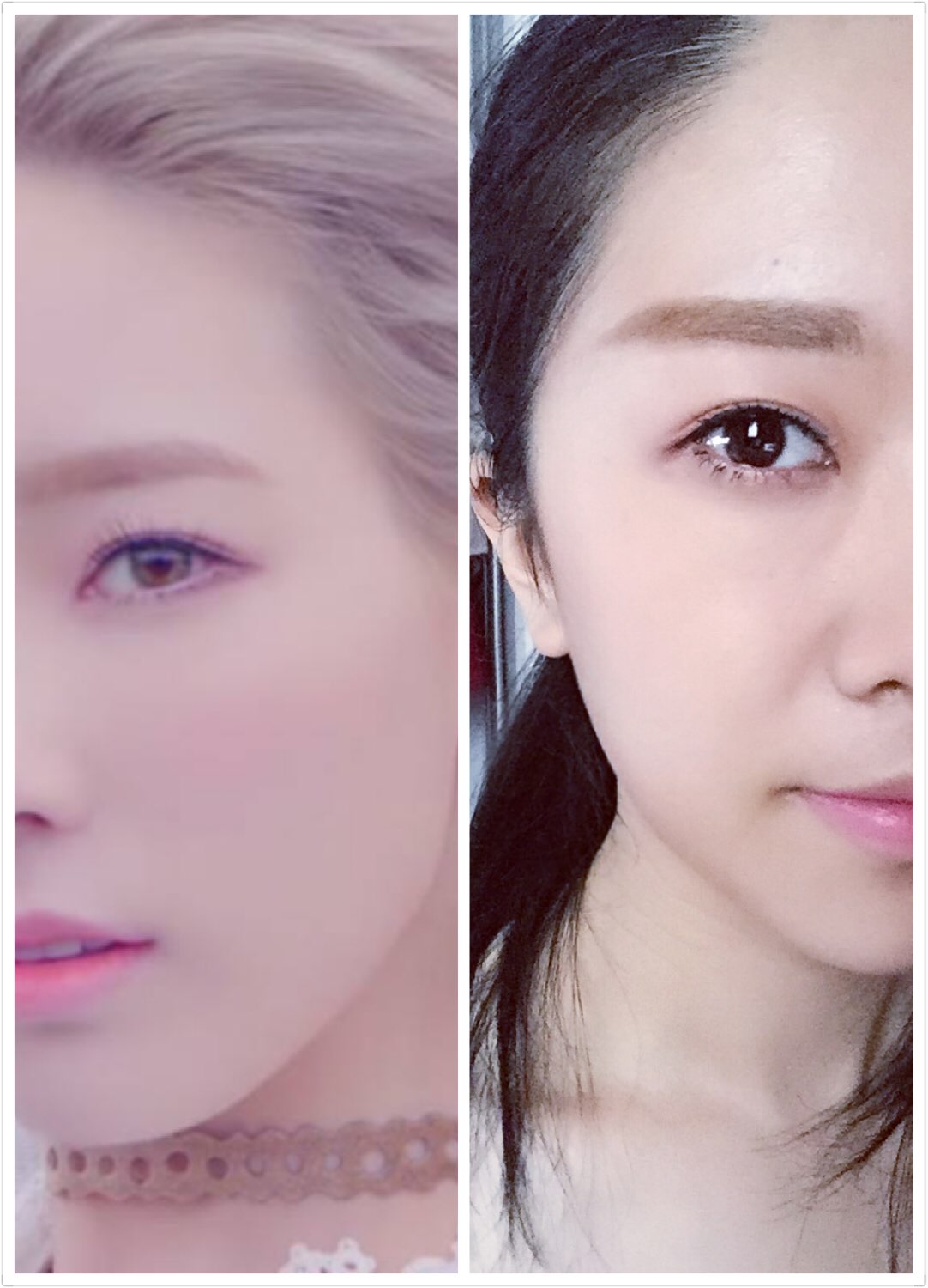 哈哈,看来有专业的眼睛下面微发灰色那边是黑眼圈,晚上光线不太好拍照了把腮红弱化了,想加一点腮红再拍已经没阳光了,作罢。P了一个偏蓝的颜色想尽量靠近对比图,Taeyeon的脸型太完美了,脸上没任何松弛,眼睛那边没有任何凹陷,我脸都有点下垂了,用了一点小脸。T-T眼睛下面微发灰色那边是黑眼圈,晚上光线不太好拍照了把腮红弱化了,想加一点腮红再拍已经没阳光了,作罢。P了一个偏蓝的颜色想尽量靠近对比图,Taeyeon的脸型太完美了,脸上没任何松弛,眼睛那边没有任何凹陷,我脸都有点下垂了,用了一点小脸。T-T