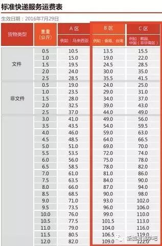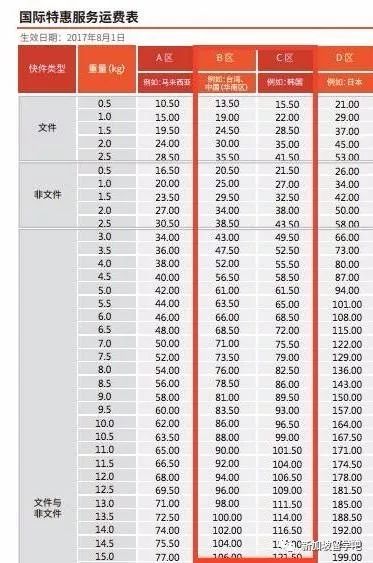 作为中国快递界老大哥,顺丰早已将走向世界。国际快递是其主营项目之一。顺丰推出多档次的国际服务,包括国际标快,国际特惠等。顺丰将中国区分为华南区(B区)以及非华南区(C区)。B区与C区配送时间和价格也有所差异。运输时长国际标快:华东、华南及华北 2个工作日 其他省份 2-3个工作日国际特惠:华东、华南及华北 3-6个工作日 其他省份 4-7个工作日运输费用顺丰国际标快 价格如下