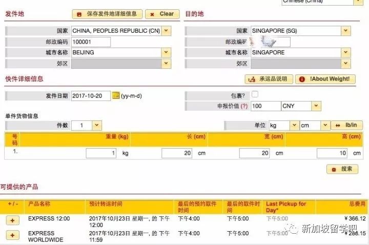 按照要求在网站上http://dct.dhl.com/#shipping_options输入信息,点击“搜索”就能一键获得DHL提供的服务与价格了。貌似比顺丰贵上不少哦。