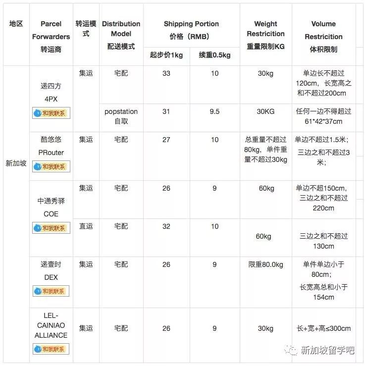 建议大家一定要找靠谱的小“人肉”哦!优点:价格相对较低,时间灵活。缺点:能带的东西有限,对小”人肉“的信用要求高。运输公司刚到坡坡的小伙伴可能会困惑,要选什么样的快递公司?毕竟,这里没有中国的各种通,也没有随时上门取件的贴心服务。小编在这列举了几个主流的运输公司大家可按需选择。1新加坡邮政
