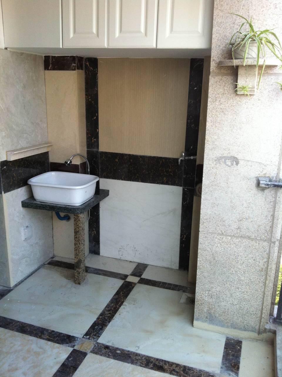 图为客厅的卫生间一角。这块角落是随时放置洗衣机或者是安装洗手盆的备用处,洗衣机已放在阳台上了,洗手盆也安装在座便器的对面了。 -
