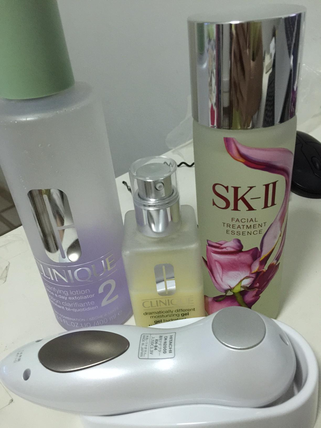 一直坚持用Clinque的3-step(Cleanser除外),个人感觉洗面奶没有必要买那么贵的,所以用的是Exfoliate和小黄油,再加倩碧自家的眼霜,都是比较中下端的平民护肤品。最近去了日本,入手了心仪已久,在日本药妆店基本脱销的日立美容仪N-2000(N3000太贵不舍得),和被狮城帮妹子们吹捧到超神的Sk2神仙水,开始发现这两件真的都是神物,用了以后首先不长痘了,其次皮肤变嫩了(真不是给他们做广告)...用过的妹子们都知道