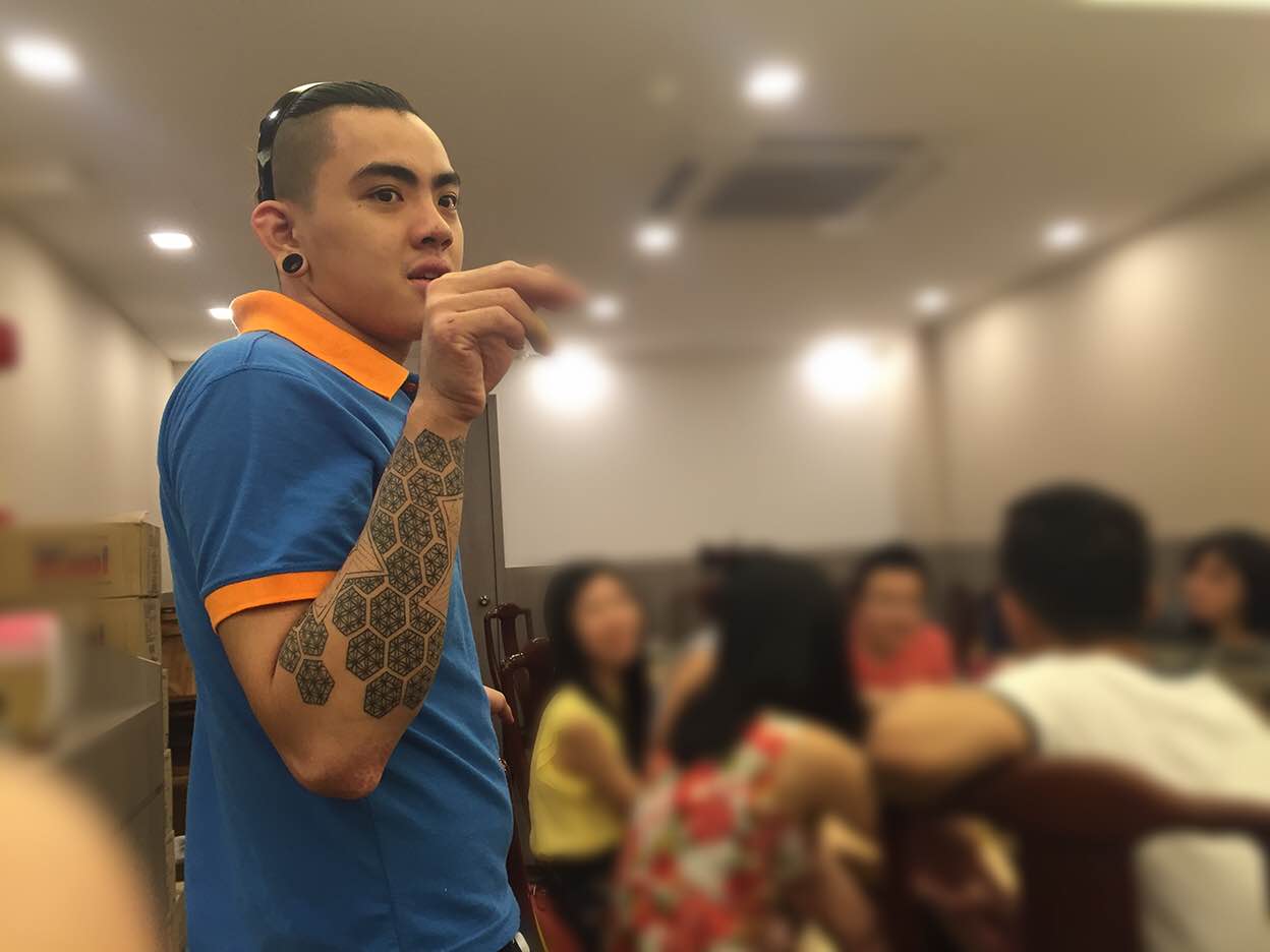 每次上菜的时候,右手一伸上桌子,全桌人就会注视这酷酷的纹身