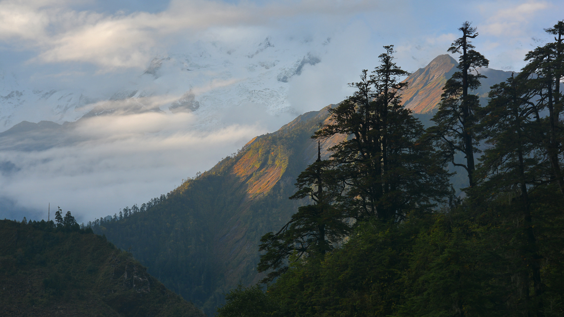 当时没有注意,整理照片时才发现。南迦巴瓦顶峰附近的cornice,相当巨大,以前从正西面看得到一个,现在看不到了。照片是从背面偏东方向拍的,说明南迦巴瓦顶上的冰雪活动相当频繁