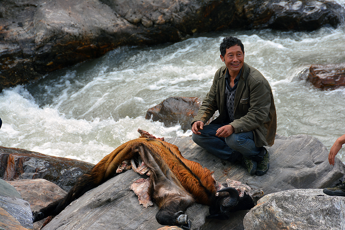 这张皮是从熊嘴里抢下来的,也就是让我摔断肋骨的那只熊。按推理,这只喜马拉雅羚牛应该是前一夜被狼追逐攻击受伤的,熊捡了便宜,吃饱了在旁边江边睡觉。我的猎人向导想把吃剩的牛腿抢来吃,就趁着黑熊睡觉从高处用石头砸熊脑袋。熊受伤逃窜不幸往我的方向过来,我和熊相隔一块巨岩互相看不到,但不幸选择了同一边,于是面对面遭遇了。听到熊吼叫之前我没有做任何准备,因为要砸熊的决定是猎人们用藏语讨论的,我还在继续选择地形摄影。幸好熊被砸受伤之后估计怕了,也被我吓到,所以反向逃窜没有攻击。 -