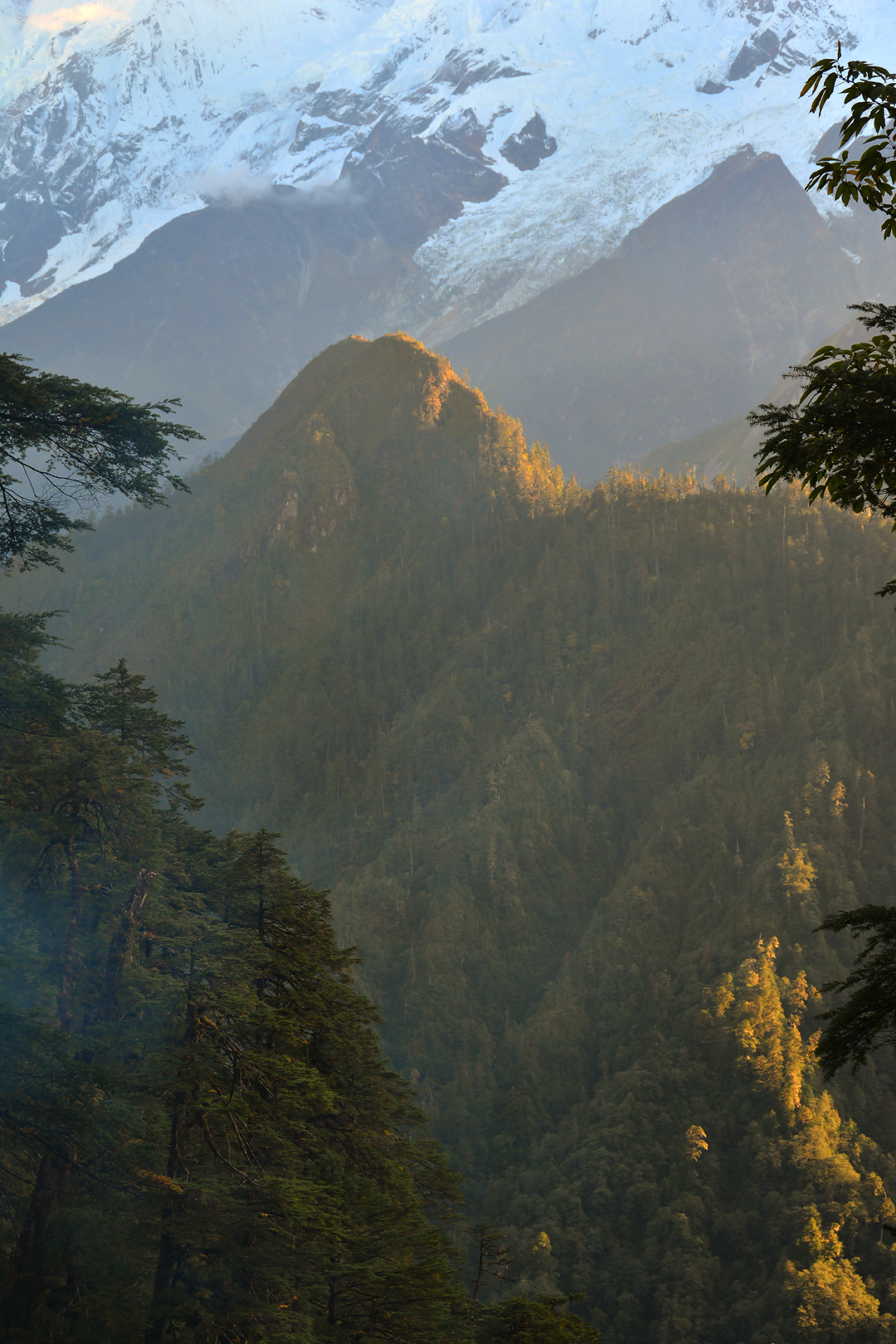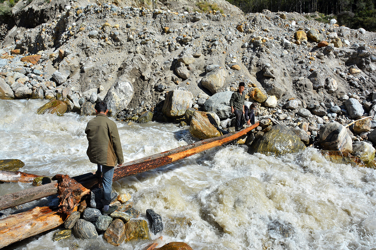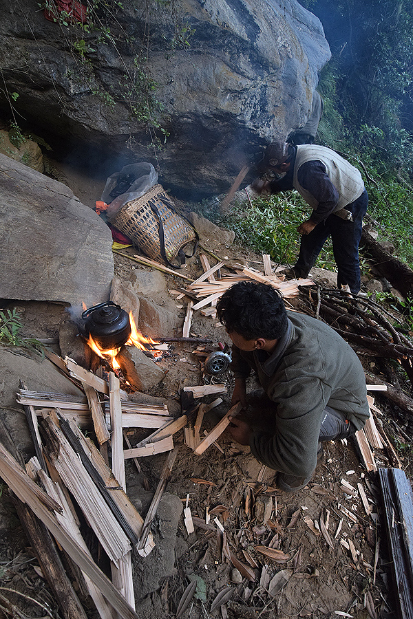 这张皮是从熊嘴里抢下来的,也就是让我摔断肋骨的那只熊。按推理,这只喜马拉雅羚牛应该是前一夜被狼追逐攻击受伤的,熊捡了便宜,吃饱了在旁边江边睡觉。我的猎人向导想把吃剩的牛腿抢来吃,就趁着黑熊睡觉从高处用石头砸熊脑袋。熊受伤逃窜不幸往我的方向过来,我和熊相隔一块巨岩互相看不到,但不幸选择了同一边,于是面对面遭遇了。听到熊吼叫之前我没有做任何准备,因为要砸熊的决定是猎人们用藏语讨论的,我还在继续选择地形摄影。幸好熊被砸受伤之后估计怕了,也被我吓到,所以反向逃窜没有攻击。每个周末就能整理几张照片而已