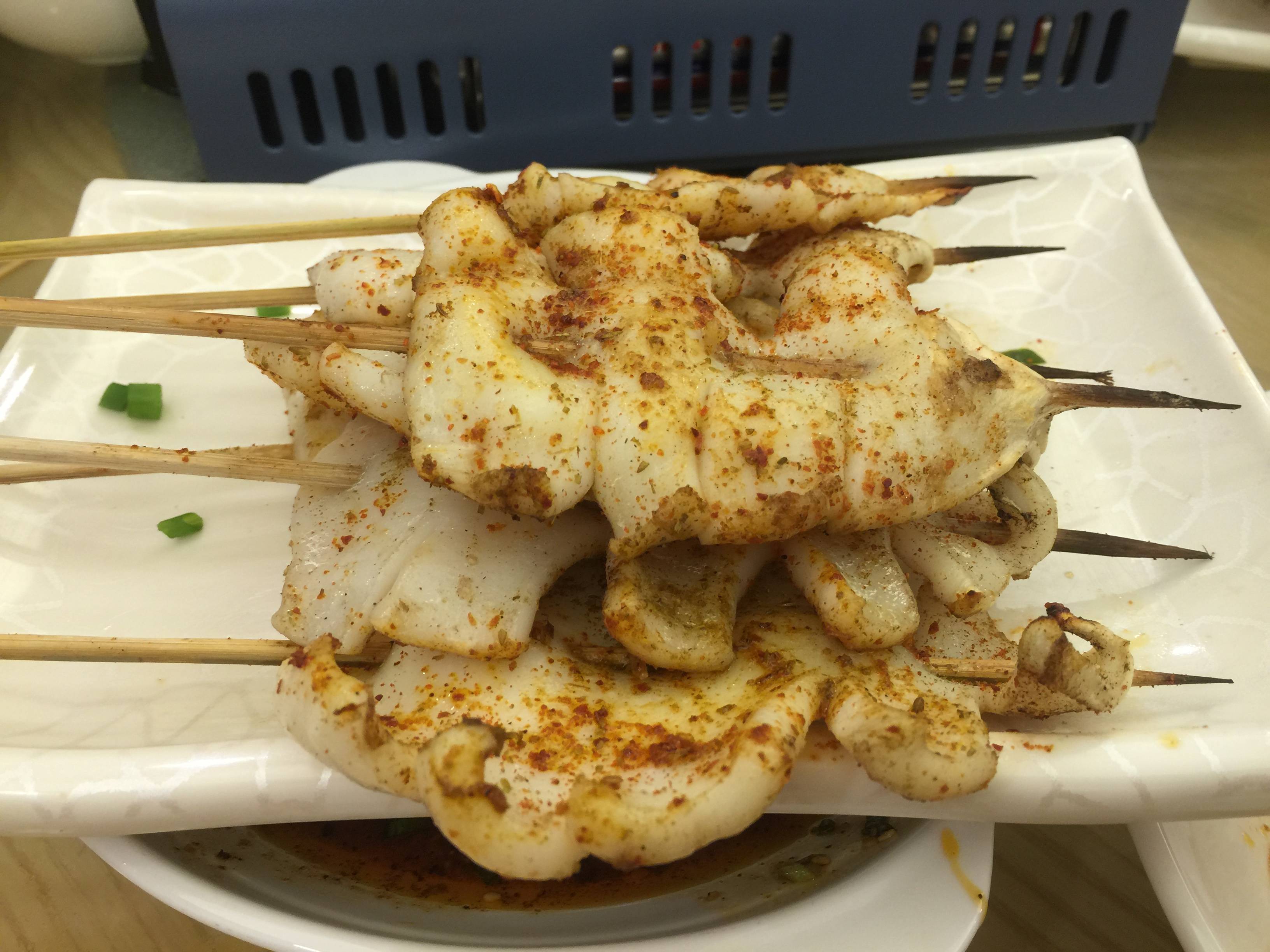 第一个,烤鱿鱼。作为海边长大的妹子,小时候放学后每天都得来一串烤鱿鱼啊!我对鱿鱼是真爱啊!!然而王大爷烤的鱿鱼,不入味,而且鱿鱼感觉是先煮熟了又拿到火上加了点调料,调料完全在鱿鱼的表面,这个我只能给5分,这5分是看在鱿鱼还挺新鲜的份上。