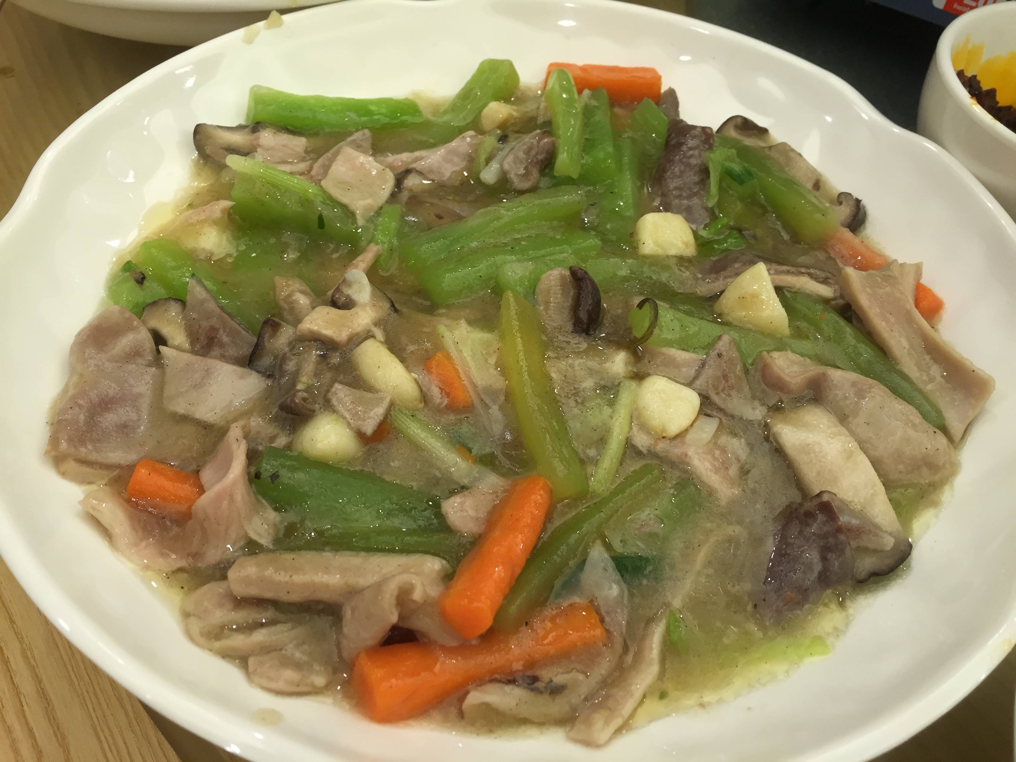 作为一个爱吃内脏的人,我又注意到了这盘莴笋炒肚片!这个菜盘子很大,分量很足,有我喜欢的莴笋,味道总体还不错,但还是偏咸,以及勾芡的淀粉放得有点多。不过还是受到了小伙伴们的青睐,因为后来都被吃完了!这个我给8分!