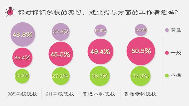 从985工程高校,211工程院校,再到普通本科院校,能够为学生提供丰富且有效的实习信息及机会的比例依次递减,而普通本科院校在这方面的水平还不如专科。