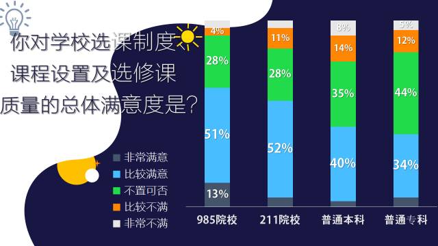 普通本科院校的同学,认为自己学校开设的选修课质量非常高的只占3%左右,而985工程院校同学持这种观点的就占了超过20%