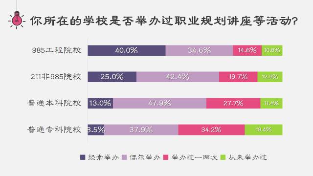 水平越高的大学越经常举办职业规划方面的讲座活动,而普通本科高校同学的类似活动远远不能满足同学们的需求。