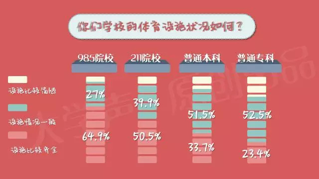 而占中国大学绝大多数的普通本科学校,体育设施的建设水平则难言乐观,认为自己学校体育设施水平比较好的只占三分之一,还有15%的同学认为自己学校的体育设施比较烂或者烂到家了。
