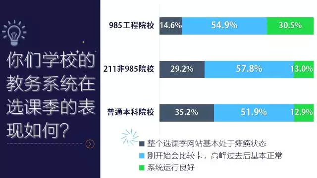 985高校中,只有不到15%的学校教务系统在选课季卡的非常严重,基本处于崩溃状态,而30%以上则系统运行一直良好,基本没有卡的现象;