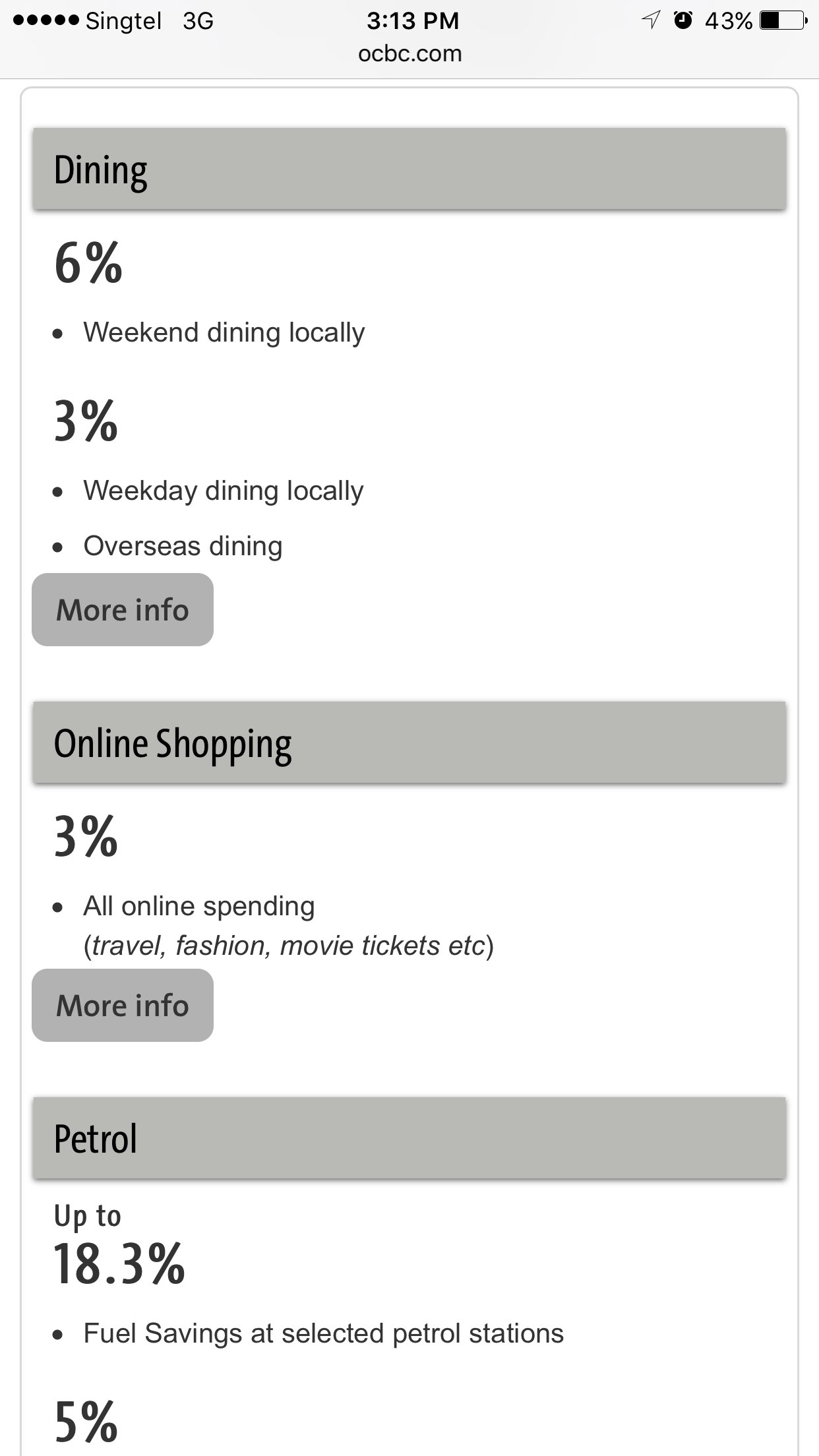 posb everyday超市有5%吃饭有5%。。。。。打油也有,还有Watsons也有3%。超市有5%吃饭有5%。。。。。打油也有,还有Watsons也有3%。