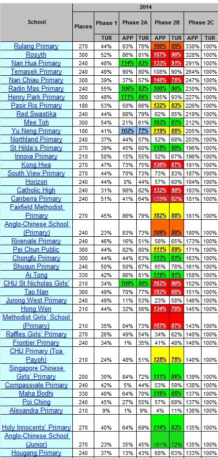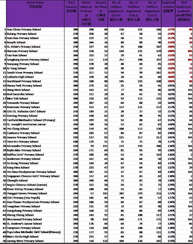 帮你找到去年的资料,pei chun 在2C阶段超报率是171%,需要抽签,见下图。其他学校往年的可以去kiasuparents 论坛上找找看