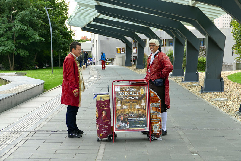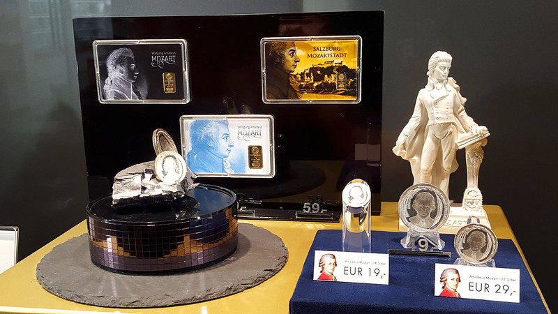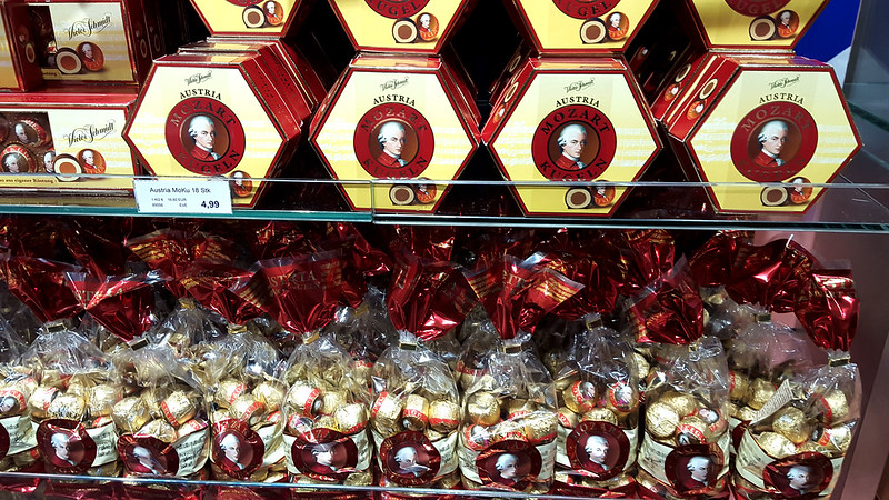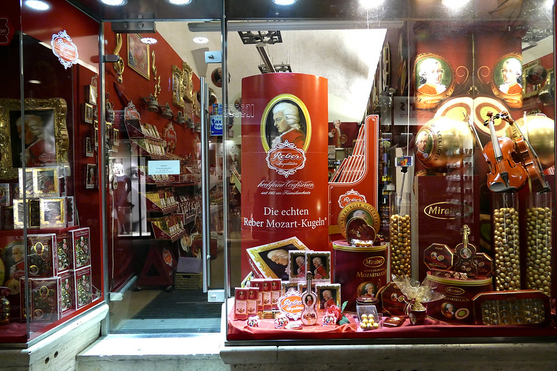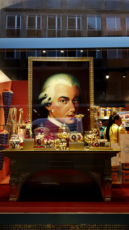 12. 沿途所见,莫扎特被全面商业化了。据一位导游介绍,现今商家对莫扎特品牌开发带来的产值达到了每年500亿欧元。