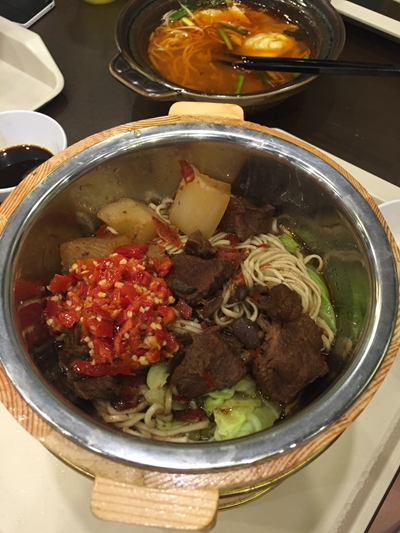 家属点的太极面, 酸萝卜鸭汤面和泡椒牛肉面。 泡椒牛肉面却像是剁椒做的。 不过, 味道还是不错的。 在我吃的几种中, 算是比较好吃的了。