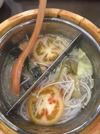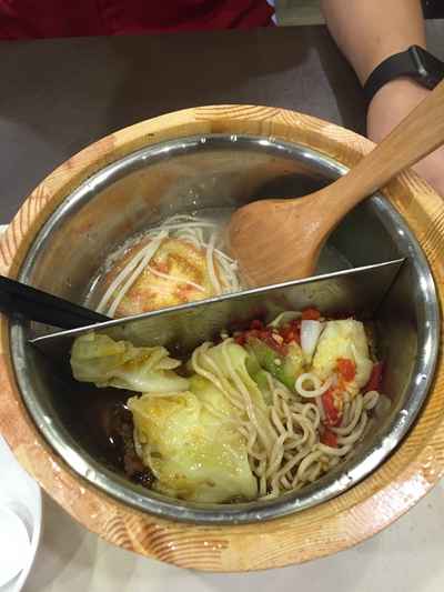 我点的是太极米粉/面, 所谓太极米粉/面, 就是一个锅里好像鸳鸯锅那样可以任选两种菜单1-9中的基本菜品, 只是比单点6块钱一份的基础菜品贵了2块钱, 可以两种都点面, 也可以两种都是米粉, 或者一种米粉一种面。 我们大部分的人都是点的这种太极米粉/面。 我点的是香菇鸡汤面和酸萝卜鸭汤米粉。 老实说, 味道都不咋样。 尤其是酸萝卜鸭汤米饭, 简直就是白水煮的一样, 神马味道都没有。 为了能增加一点儿味道, 我只能到柜台去拿了一些调味盐, 一点儿辣椒, 一点儿酱青,分别倒在两份米粉里, 才有些味道, 可以吃了。另外, 米粉的量给的很少, 但是面的分量还可以, 建议大家都不要吃米粉, 还是点面吧。