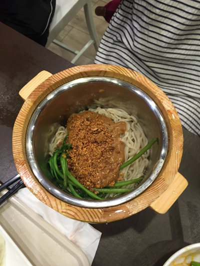 ggyt点的麻酱面, 因为只有麻酱, 没有其他什么菜, 看上去真的是好少啊, 就是覆盖了底部那么一层。 别说男生了, 估计连ggyt这样的秀气女子都未必能吃饱吧。