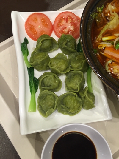 菠菜饺子, 一人一个, 我的给我孩子吃了, 我没有尝到。 应该味道不错吧, 因为我宝宝一下子就全部吃光了。