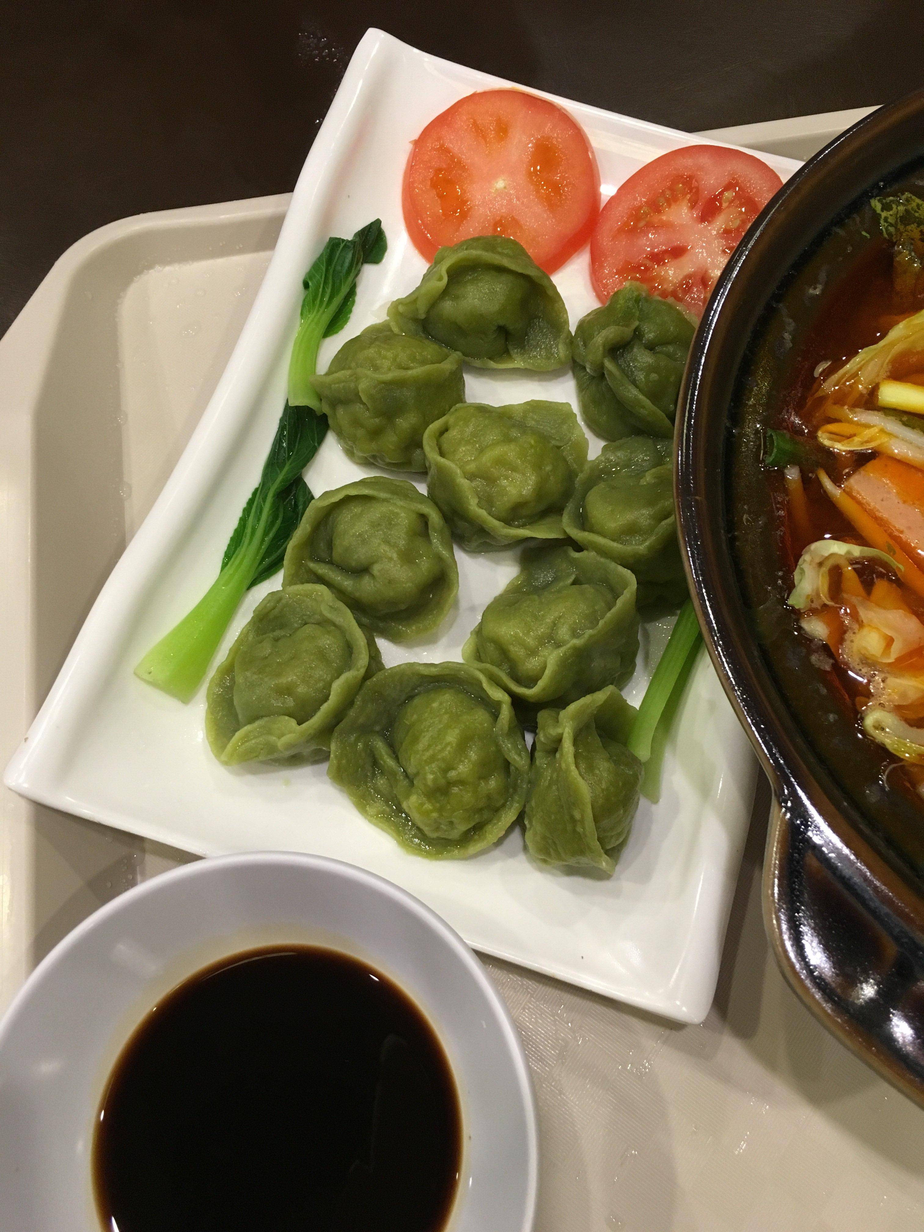 这个饺子似乎是新的菜单上的。面皮里有菠菜汁,不过其实只是好看啦,没吃出来菠菜味儿。。。