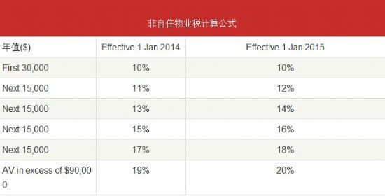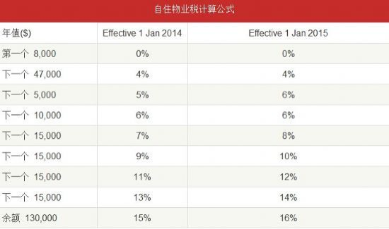 从2014 年1月1日起,对于业主自住和非自住的房产,根据新的累进税制,业主需要缴付的物业税计算公式为:
