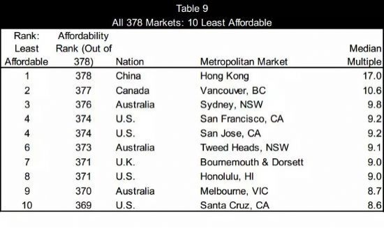 全球10个可负担能力最差的房地产市场:1香港、2温哥华、3雪梨、4旧金山、5圣何塞、6墨尔本、7伦敦、8圣地亚哥、9奥克兰、10洛杉矶。庆幸的是新加坡并为上榜。