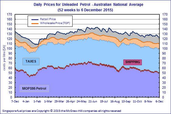 澳洲汽油零售价=新加坡MOPS95价+运输(可忽略)+exercise duty (0.392)+ 石油公司营运 + 油站营运 + GST (10%) = 1.25