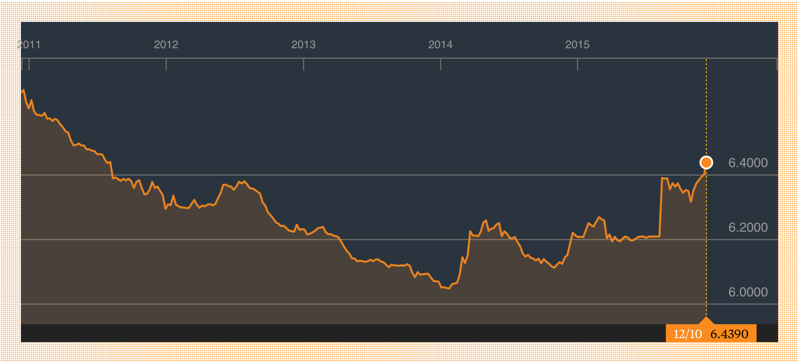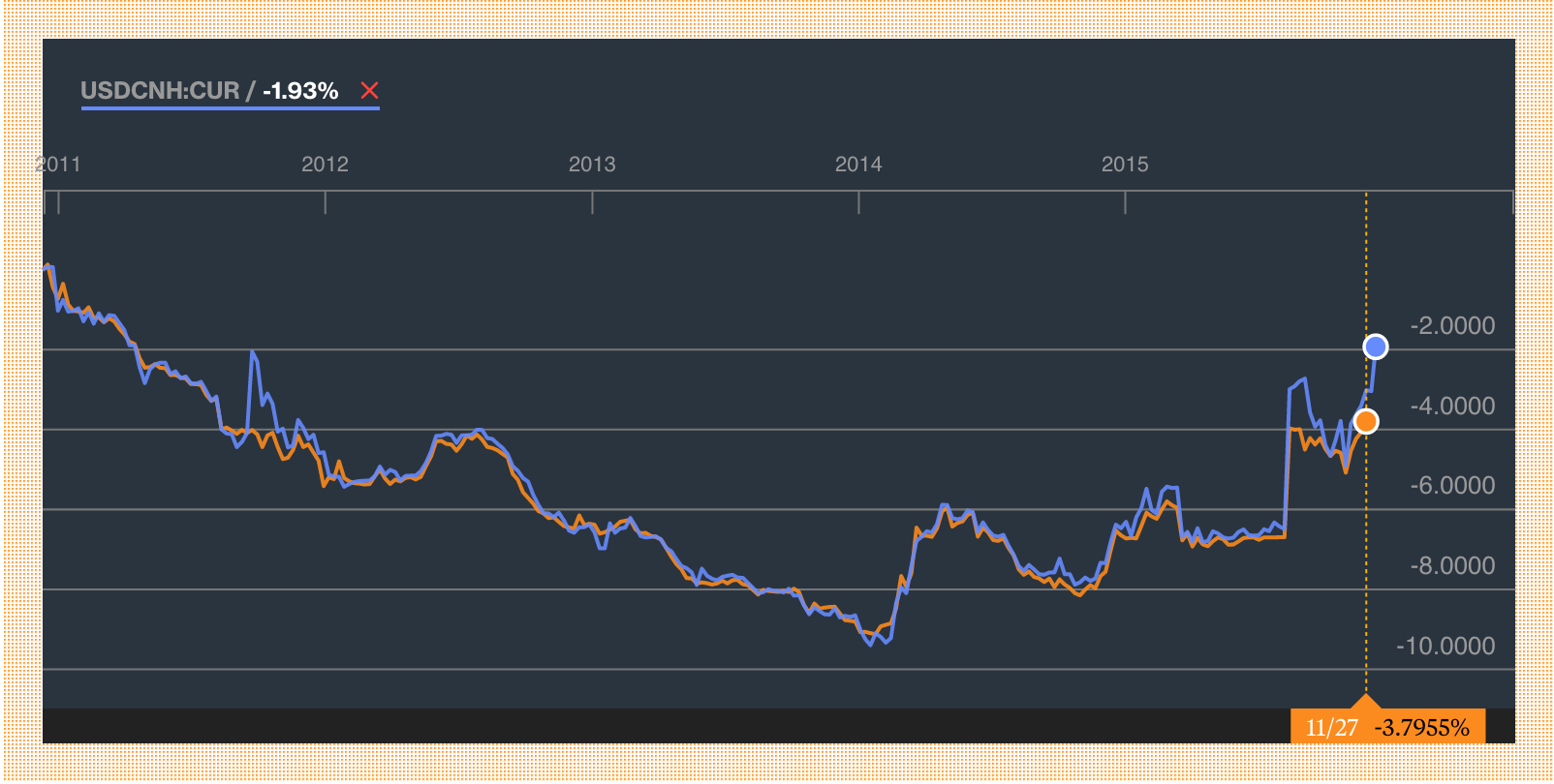 在岸人民币(橙色)vs 离岸人民币(蓝色)