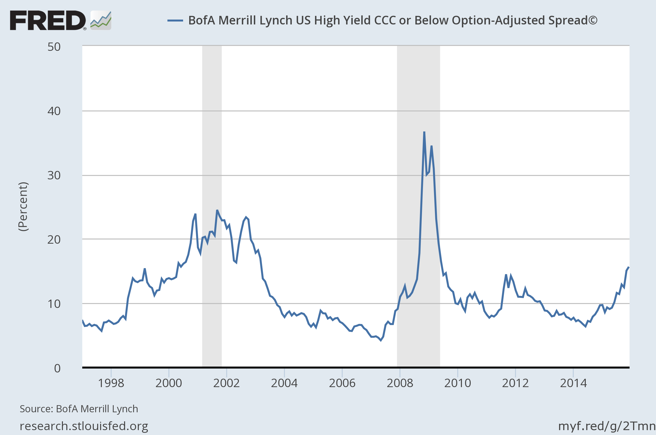 阴影是衰退期间。上次(2008)时垃圾债券利息超过10%时经济进入衰退。