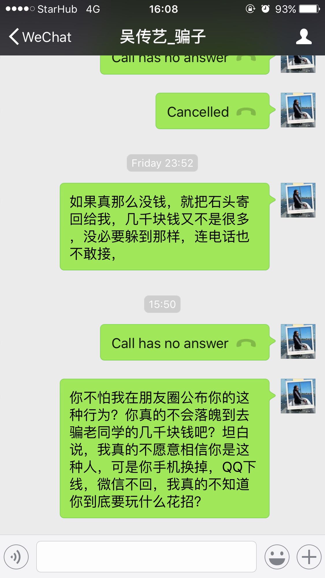 几千是人民币,不是新币唉~我也不知道到底是什么情况,如果他能联系我,直接告诉我遇到什么困难、或是直接告诉我,就是要骗我,我或许会比较狠一点,现在的情况就是我一头急,他那边什么情况我完全不了解,根本联系不到,做绝了,万一真的他有什么困难,我又不想陷入将来的自责中,包括我还都不敢把这些事情告诉同学,很多次想说,后来都忍住了,唉~我也不知道到底是什么情况,如果他能联系我,直接告诉我遇到什么困难、或是直接告诉我,就是要骗我,我或许会比较狠一点,现在的情况就是我一头急,他那边什么情况我完全不了解,根本联系不到,做绝了,万一真的他有什么困难,我又不想陷入将来的自责中,包括我还都不敢把这些事情告诉同学,很多次想说,后来都忍住了,