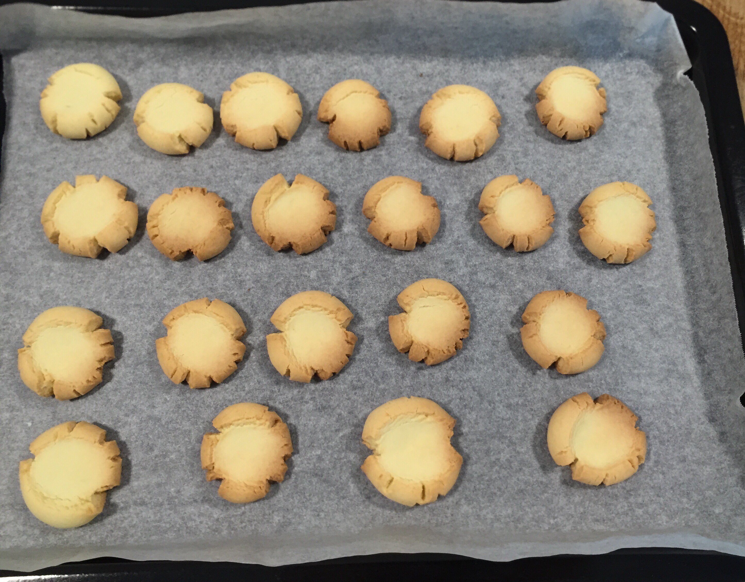 保鲜膜包好放入冰箱有一个小时,拿出来硬了不少然后用个小汤匙挖一点放在手心揉成个球球,用大拇指一按-就好了。我是搓好一个tray的球一次过按的。