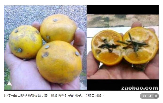 网民在网站上分享,指马国近期出现抢劫狮城客的新招数。不法之徒将插满钉子的橘子放在马路中央,让行驶过的轿车碾过,导致轿车爆胎。一旦轿车停下,司机下车查看时,抢匪就伺机冲出打抢。