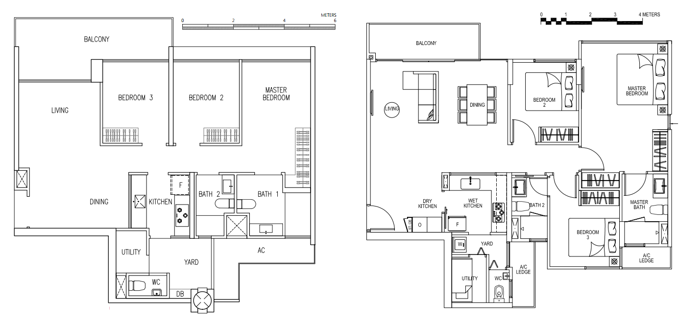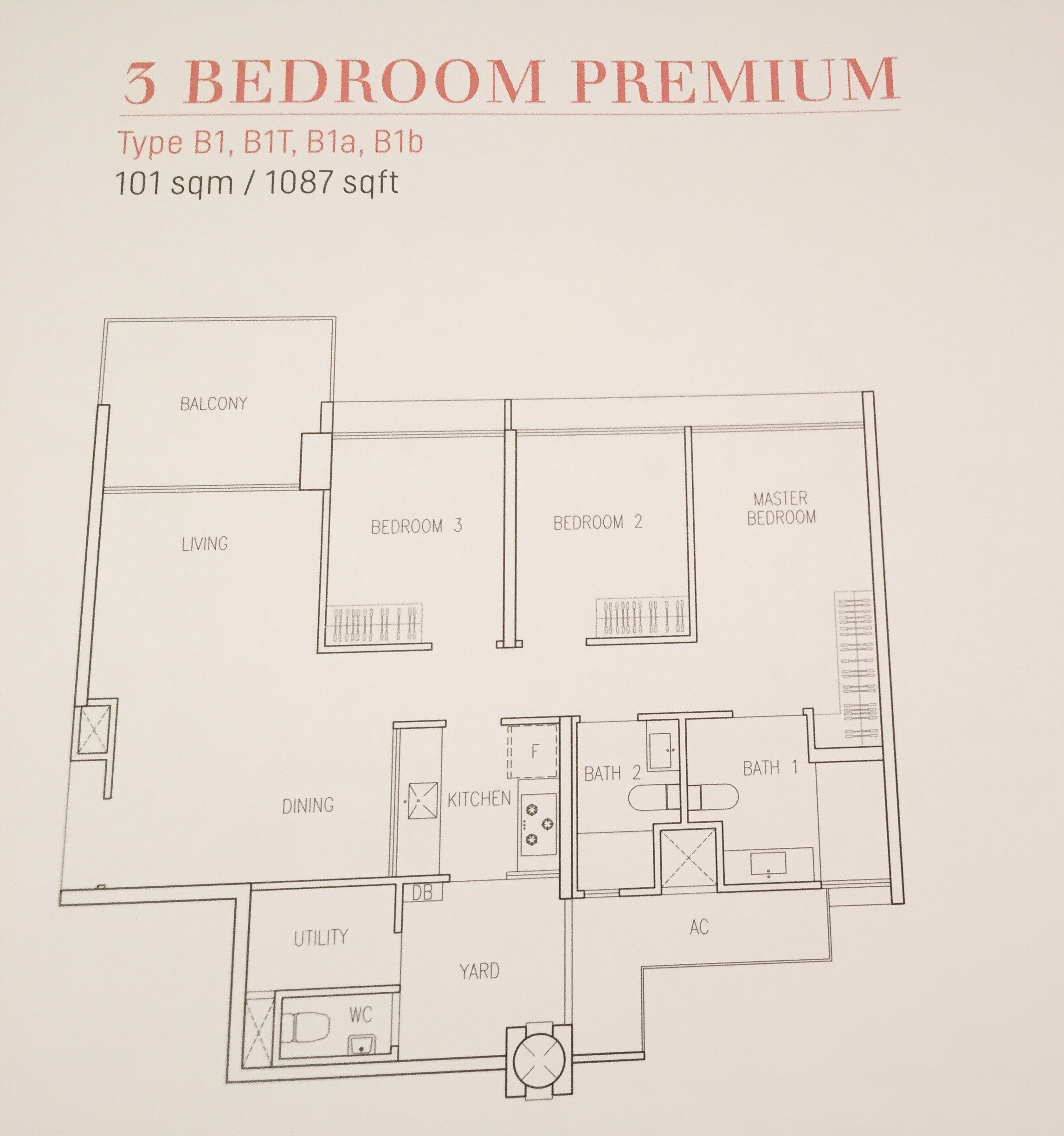 右边的floorplan看着有点乱,不过AC ledge很小, 厅大, bedroom 3 太小。 common toilet居然要进bedroom 3 才可以进,好奇怪的设计。